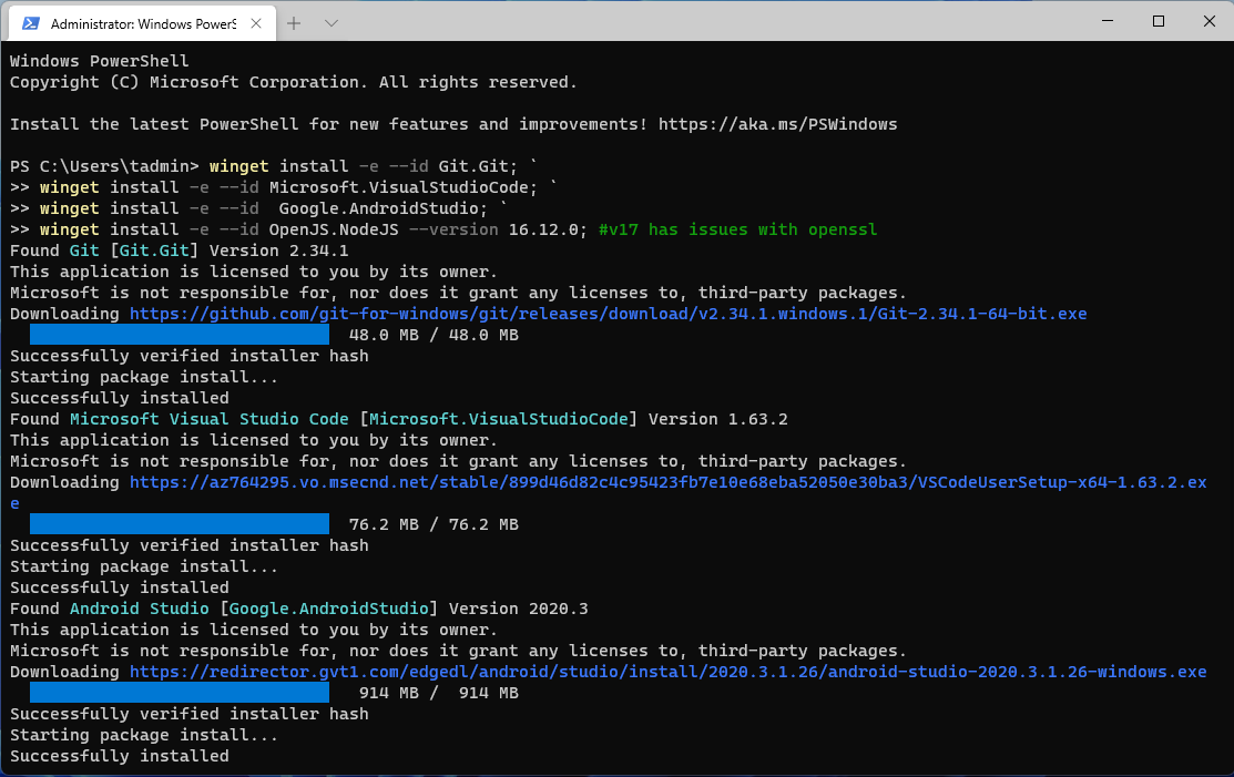 winget install -e --id OpenJS.NodeJS --version 16.12.0; #v17 has issues with openssl