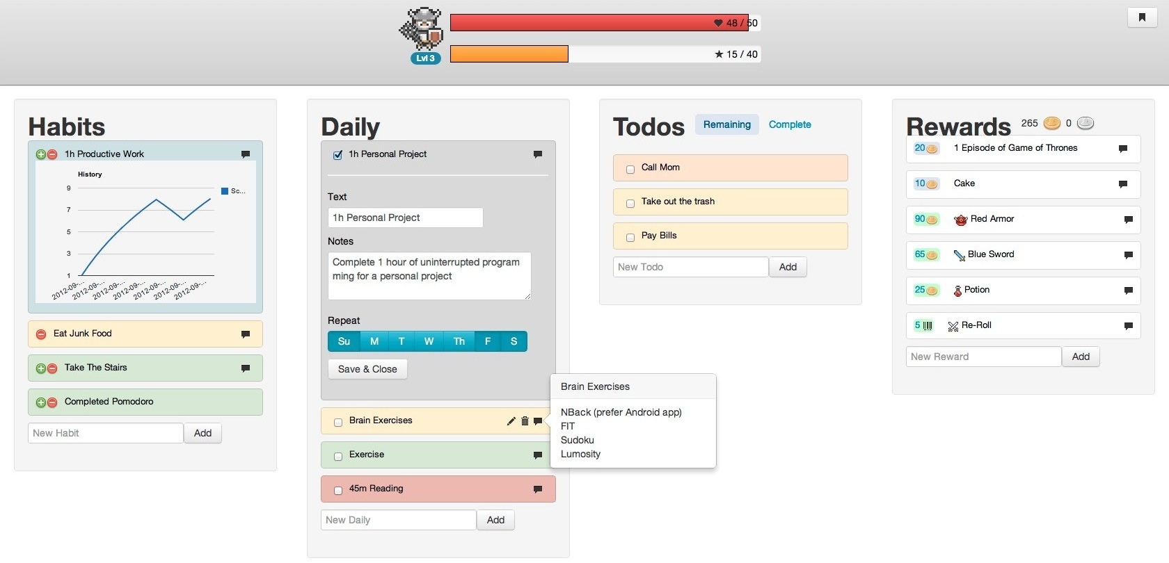 If you played RPGs (Role Playing Games) growing up, this app will make sense to you; otherwise, it might be overwhelming at first. Be sure to follow the tutorial when you first load the website. If it's still not your cup of tea, checkout Trackers vs Lifehackers for alternatives.