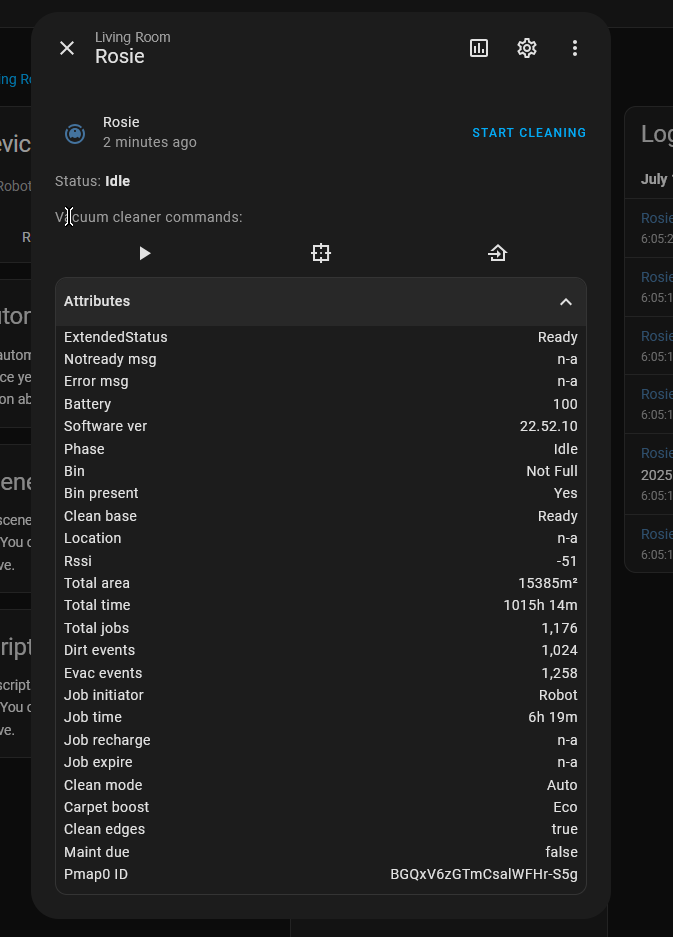 rest980 will gather all the data about our robot, but the integration will format it perfectly, creating entities and a vacuum device.